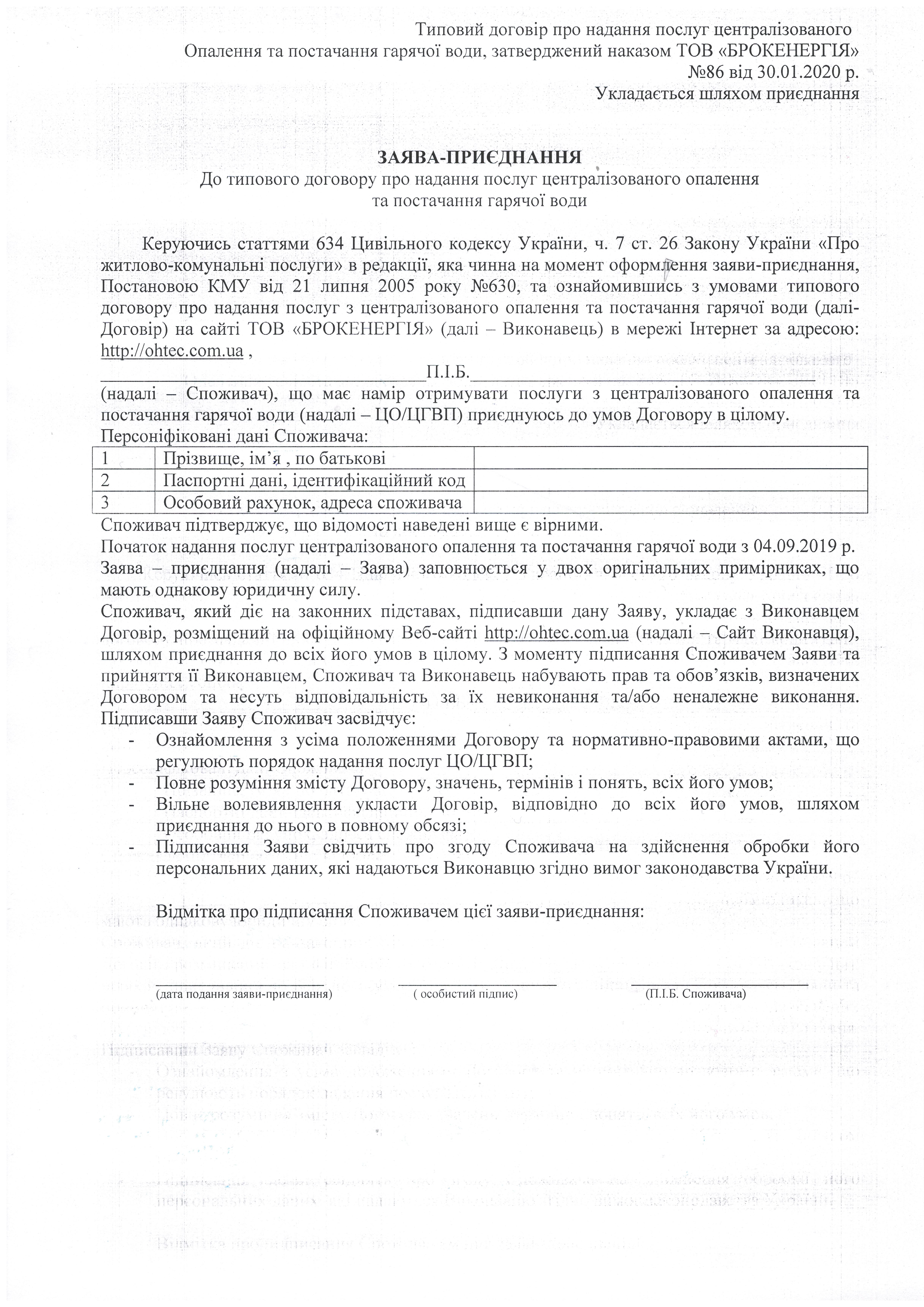 Для того, щоб укласти або переукласти договір на відпуск теплової енергії для населення необхідно звернутися власнику/співвласнику або повнолітнім членам сім"ї, які зареєстровані в квартирі, до абонентського відділу підприємства.